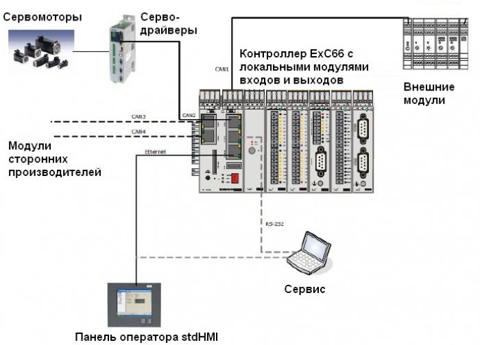 Для подключения прочих периферийных устройств в наличии имеются стандартные платы ввода/вывода (дискретные и аналоговые). Модули сторонних производителей можно подключить при помощи специальных переходников к шине CANOpen или SERCOS.