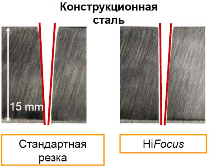 Все это приводит к тому, что в станках плазменной резки применяется специальная кинематика, которая существенно отличается от классической, принятой, например, во фрезерных станках с ЧПУ. В отличие от фрезерования, где кончик инструмента находится непосредственно на обрабатываемом изделии, при плазменной резке нужно держать определенное расстояние между соплом и обрабатываемым изделием или резом. Кроме того, сам рез тоже обладает размерами. Это приводит к тому, что, например, при наклонной установке горелки, глубина реза высчитывается как гипотенуза треугольника, один катет которого – толщина металла, а другой – сдвиг места выхода плазмы. Для большинства процессов раскроя рез имеет V-образную форму или аналогичную коническую форму, хотя в последнее время появились технологии, позволяющие добиваться вертикальности по крайней мере одной из кромок реза (например технология HiFocus компании Kjellberg, рис.3), что сравнимо с качеством лазерной резки.