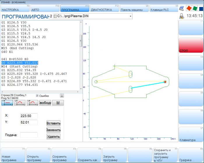 Управление станком может целиком осуществляться при помощи сенсорного экрана. Оператор может загружать ЧПУ программу в различных форматах (DXF, DIN, HPGL, ESSI), а также составлять программу с графическим ее отображением на экране, что позволяет существенно экономить время особенно при простых геометриях. Создавать новые программы, редактировать и оптимизировать уже имеющиеся можно непосредственно на станке. Большая библиотека макросов облегчает процесс составления программы (рис. 7).